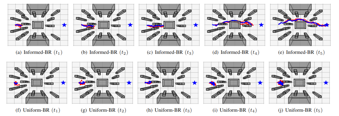performance on the adaptability. (f) to (j) shows the baseline method’s performance. The snapshot has been taken after the same number of iteration to shoe